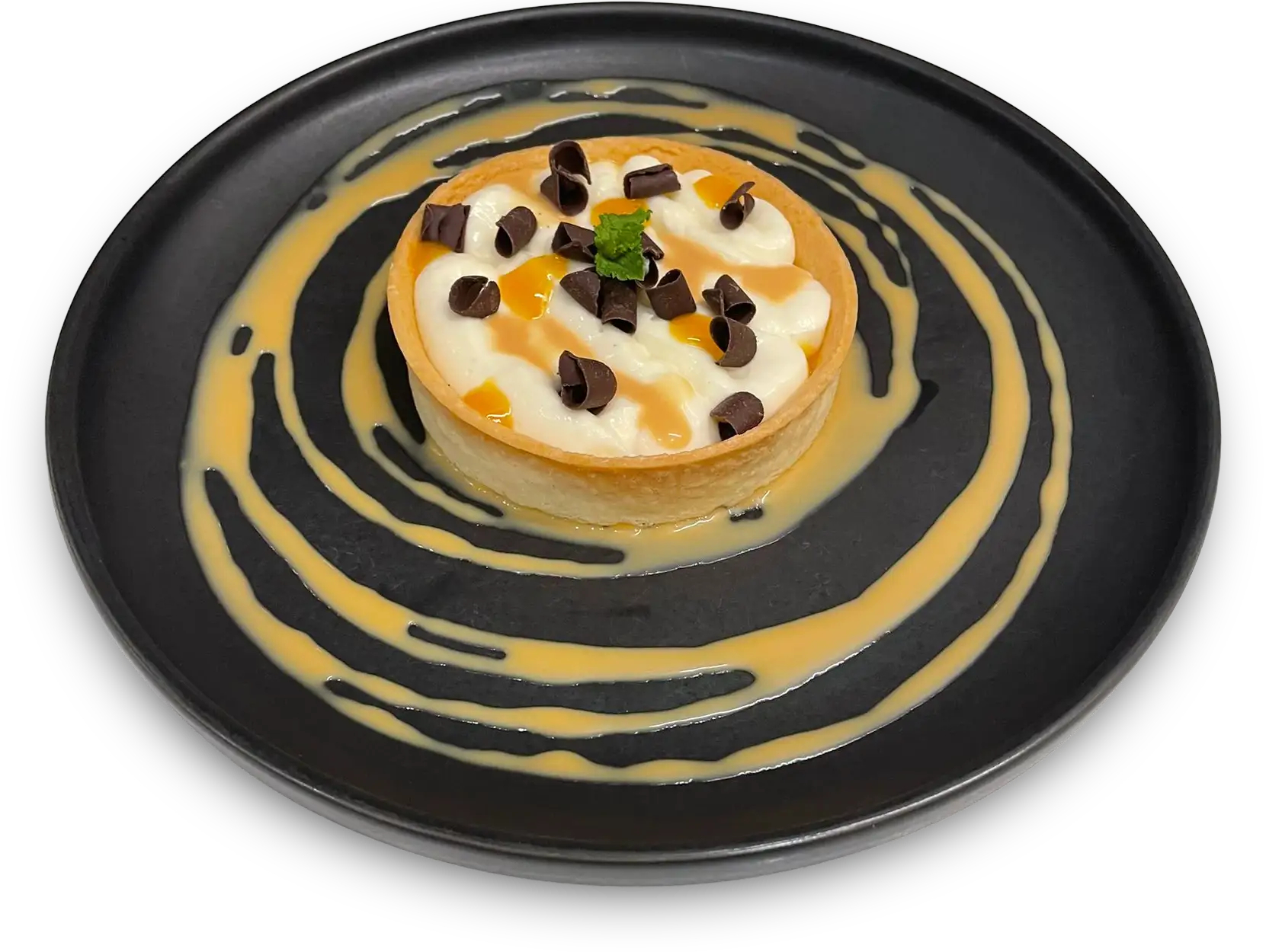 Tartelletta di pasta frolla fragrante con soffici ciuffi di Cream Cake allo Yuzu (ibrido tra mandarino, pompelmo e lime) riccioli al cioccolato fondente, essenza alla banana con burro noisette e sbriciolata al cornflakes al miele e vaniglia. [1,3,7] | 7.00
